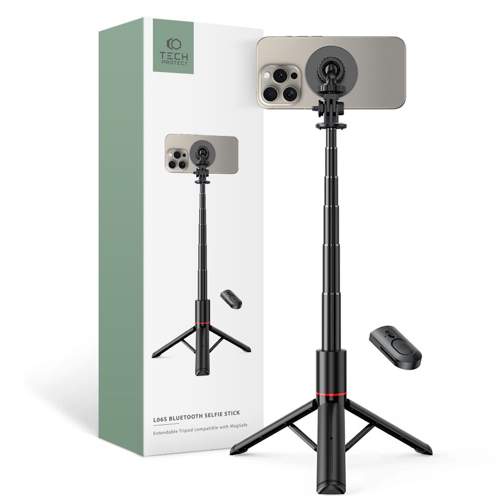 Το Tech-Protect L06S Ασύρματο MagSafe Selfie Stick με Τρίποδο και Bluetooth Τηλεχειριστήριο - Μαύρο είναι ένα πολυλειτουργικό αξεσουάρ που συνδυάζει την πρακτικότητα ενός selfie stick με τη σταθερότητα ενός τρίποδου, προσφέροντας ταυτόχρονα τη δυνατότητα ασύρματης σύνδεσης μέσω Bluetooth και μαγνητικής στήριξης MagSafe.