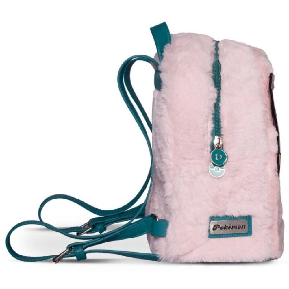 Σχέδιο: Χνουδωτό σώμα σακιδίου με κεντημένα/εφαρμοσμένα στοιχεία προσώπου Jigglypuff, μεταλλικά pull‑zippers και μεταλλικό badge Pokémon