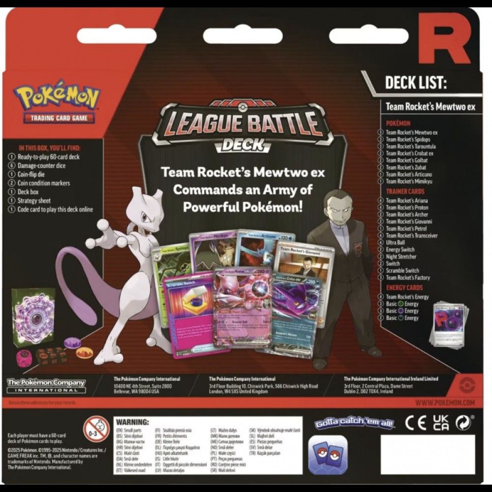 Το League Battle Deck Team Rocket’s Mewtwo ex είναι ένα έτοιμο για παιχνίδι ανταγωνιστικό deck του Pokémon Trading Card Game, εμπνευσμένο από τη σκοτεινή αισθητική της Team Rocket και με βασικό Pokémon το ισχυρό Mewtwo ex. Αποτελεί ιδανική επιλογή για παίκτες που θέλουν να μπουν άμεσα σε League και τουρνουά με ένα ισχυρό, σωστά δομημένο deck.
